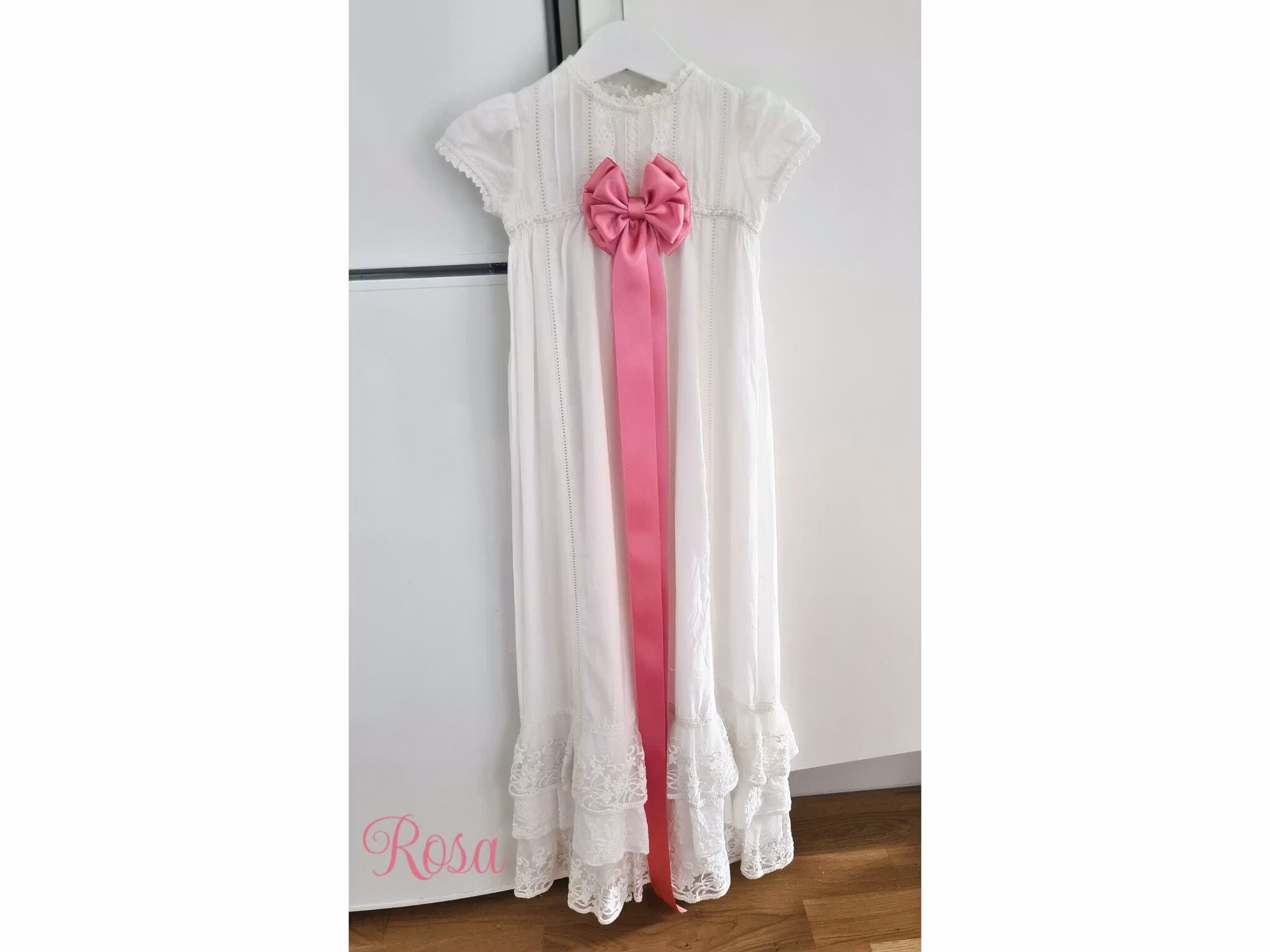 (Vill man sedan byta rosett på klänningen så sprättar man försiktigt bort rosetten och syr dit en ny)