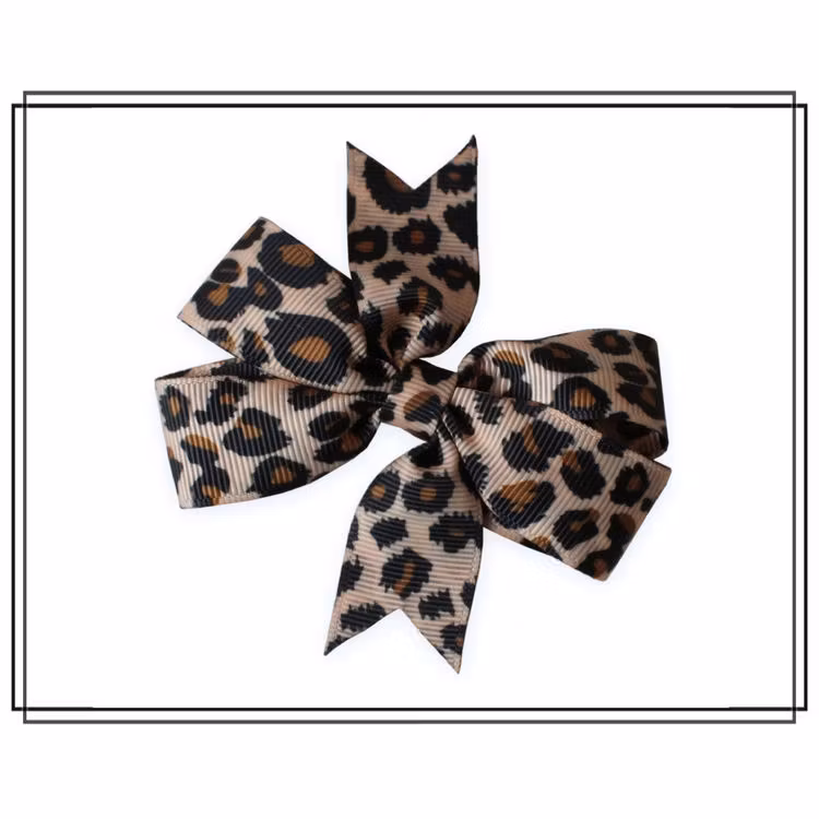 Hårklämma med en rosett gjord av leopardmönstrat ripsband.